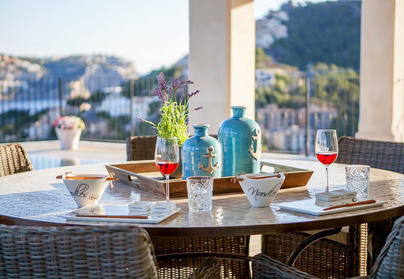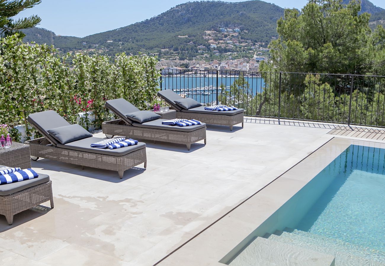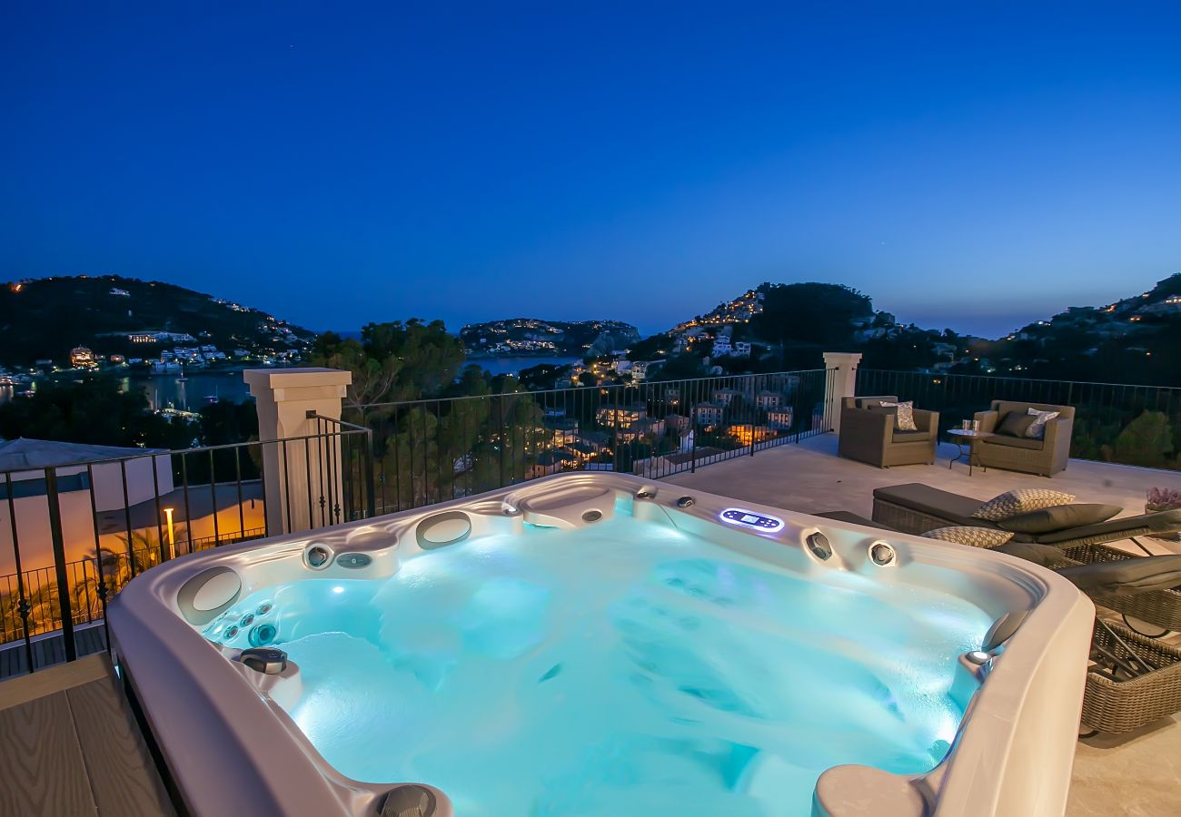 Villa Cori ist eine atemberaubende super luxuriöse Ferienvilla mit Blick auf Puerto Andratx 5 Schlafzimmer, 5 Badezimmer Villa mit Meerblick und einem privaten beheizten Pool, Klimaanlage, Wi-Fi, Satelliten-TV, in der Nähe von Golf, für maximal 8 Personen