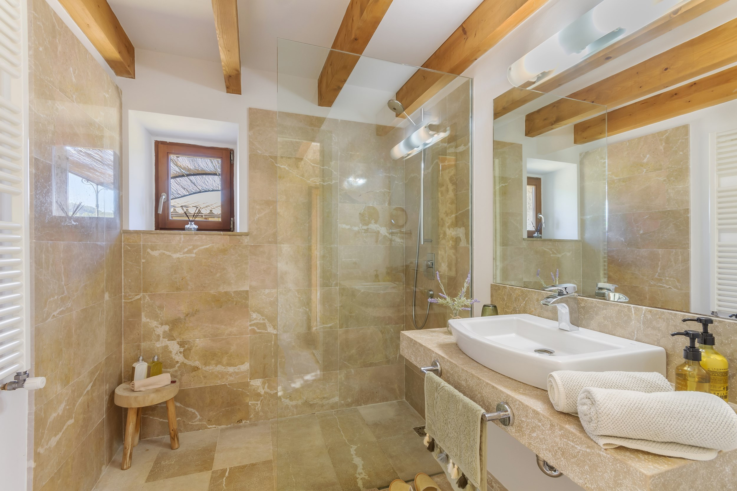 Im Inneren gibt es viel Platz für eine große Familie mit vier Schlafzimmern und insgesamt vier Badezimmern - drei der Schlafzimmer befinden sich im ersten Stock mit eigenen Badezimmern, und ein Schlafzimmer mit einem Badezimmer ist im Erdgeschoss. Alle Schlafzimmer sind vollständig ausgestattet mit Doppelbetten, die auf Wunsch in Einzelbetten geteilt werden können. Die Schlafzimmer sind komplett mit atemberaubender weißer Bettwäsche mit einem Hauch von balearischem Design und authentischem mallorquinischem Charme ausgestattet.