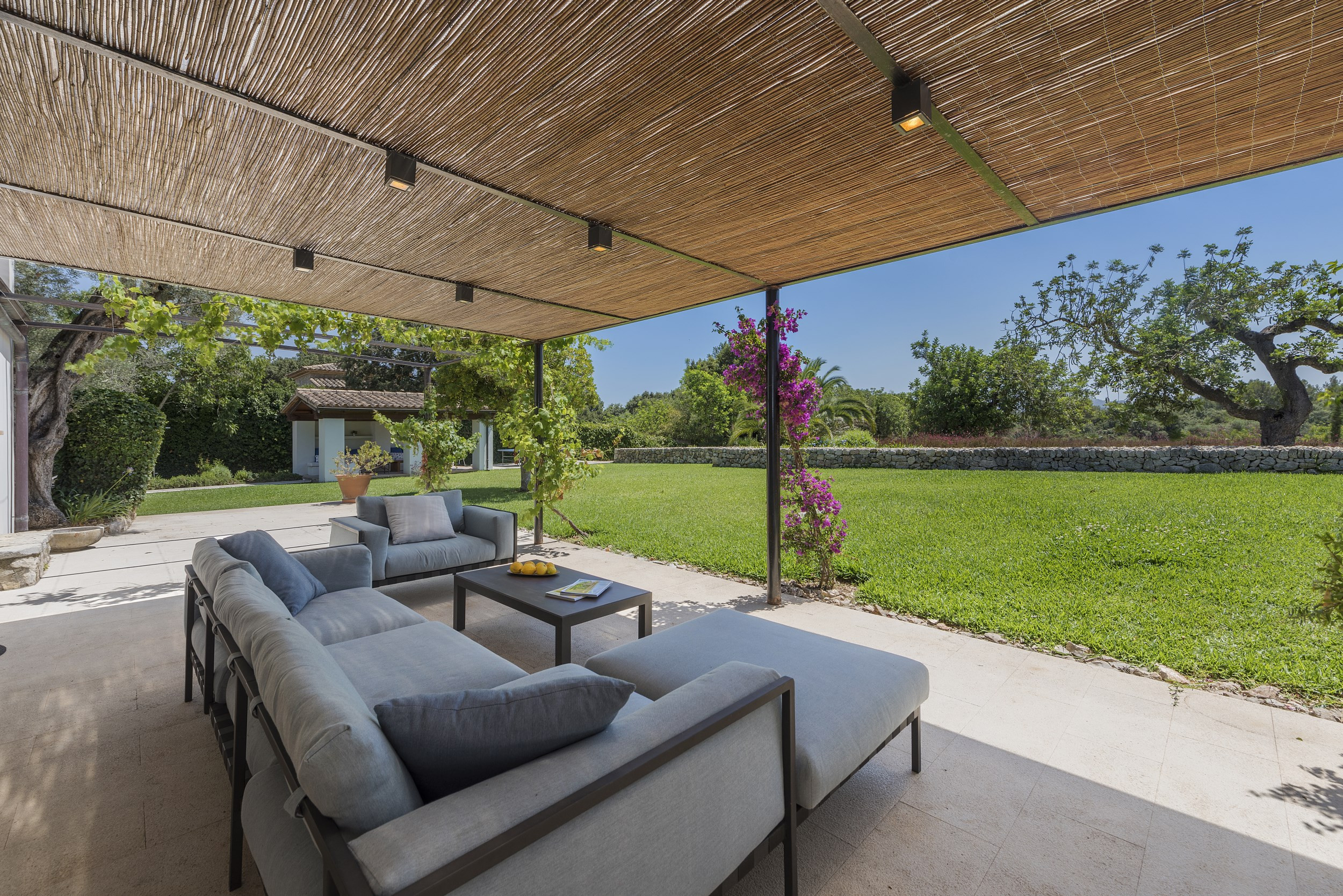 Im lichtdurchfluteten Wohnzimmer führt eine Glastür auf die überdachte Terrasse, die das ganze Jahr über zum Verweilen einlädt und auch zum Pool, der von Gras und Blumen umgeben ist. Auf dem zum Anwesen gehörenden Feld wachsen Orangen-, Zitronen-, Grapefruit-, Mandel-, Feigen- und Johannisbrotbäume.