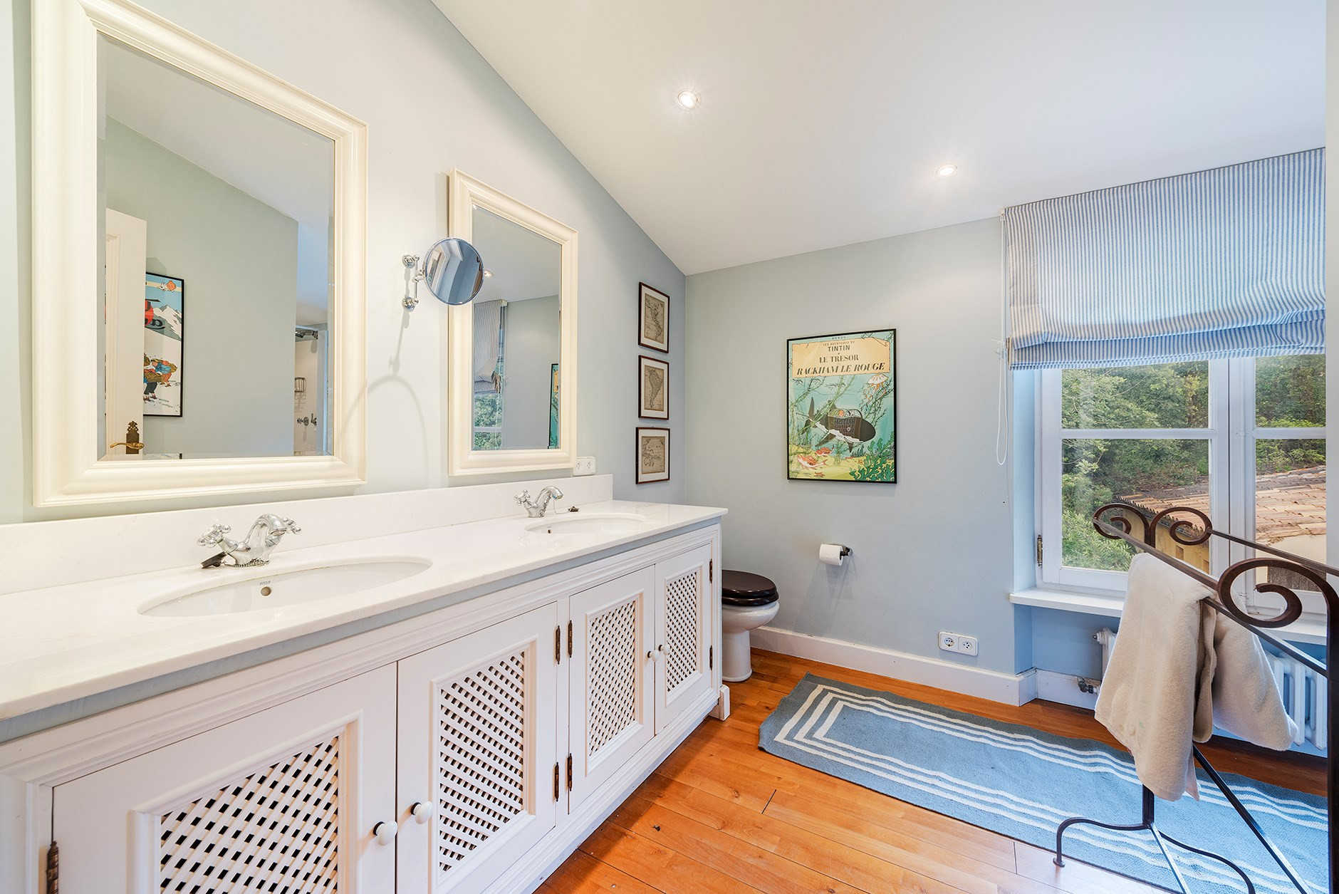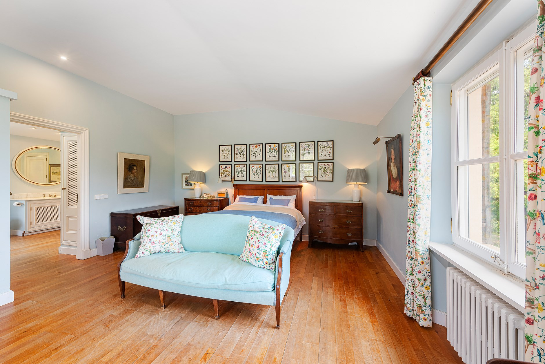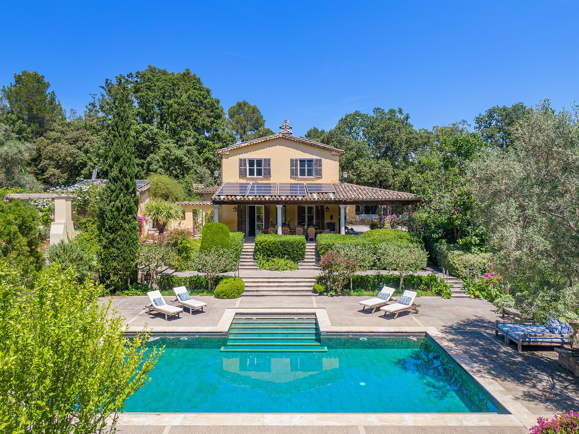 Im Inneren besticht die Villa durch elegantes Ambiente, hohe Decken, viel Tageslicht und traditionelle Materialien wie Stein und Marmor. Im Erdgeschoss befinden sich zwei großzügige Wohnzimmer, ein Speisesaal für kühlere Tage und ein Doppelschlafzimmer mit eigenem Bad. Die Küche ist komplett ausgestattet – mit Aga-Herd, Miele-Geräten, Nespresso-Maschine, Vorratsraum und separatem Hauswirtschaftsraum. Im Obergeschoss liegt die Mastersuite mit eigenem Bad, ergänzt durch zwei weitere Doppelschlafzimmer mit Bad sowie einen Kinderbereich mit Etagenbett, Zweibettzimmer und Einzelzimmer. Das Haus verfügt über Klimaanlage in allen Räumen (außer in einem der Wohnzimmer).