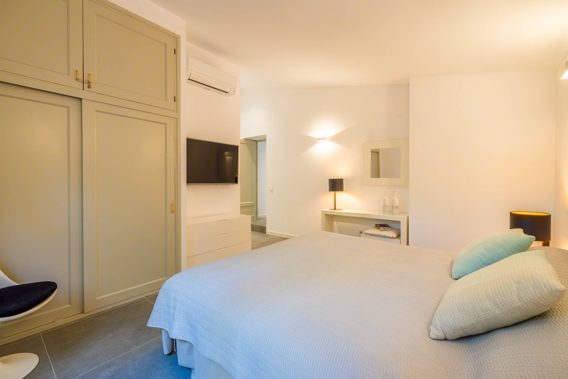 Villa Alba bietet 3 wunderschöne Schlafzimmer mit höchstem Komfort und Luxus. Das Hauptschlafzimmer ist ein Doppelzimmer; die anderen beiden haben je zwei Einzelbetten. Alle sind mit Bad en suite und Wand-Fernseher ausgestattet. Die Bäder sind hochmodern. Zudem gibt es einen komplett eingerichteten Waschraum mit Waschmaschine. Warmwasser erfolgt über Solarheizung.