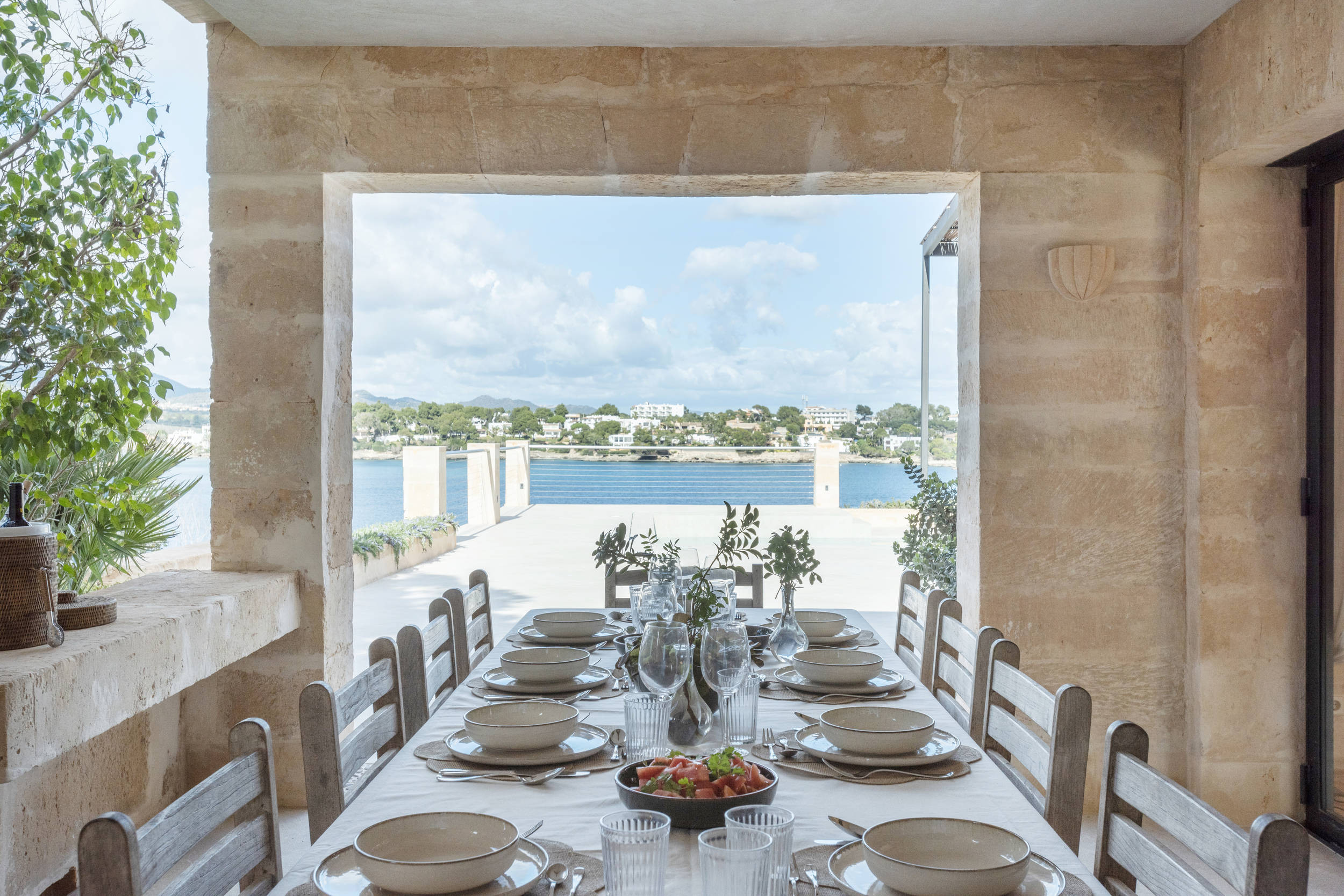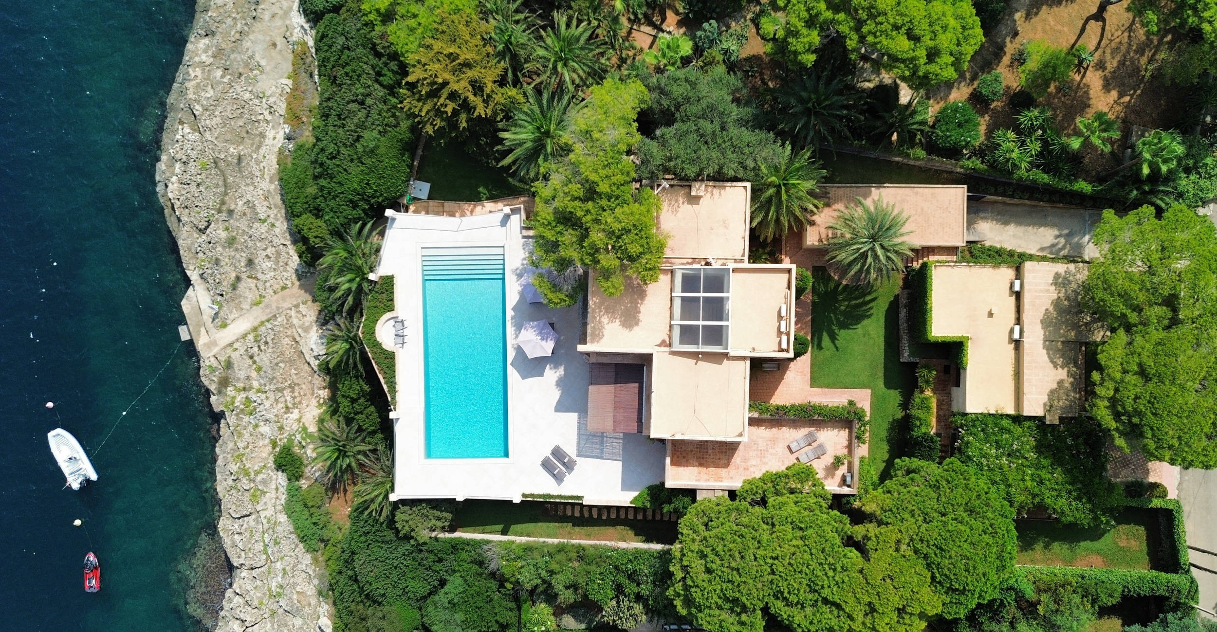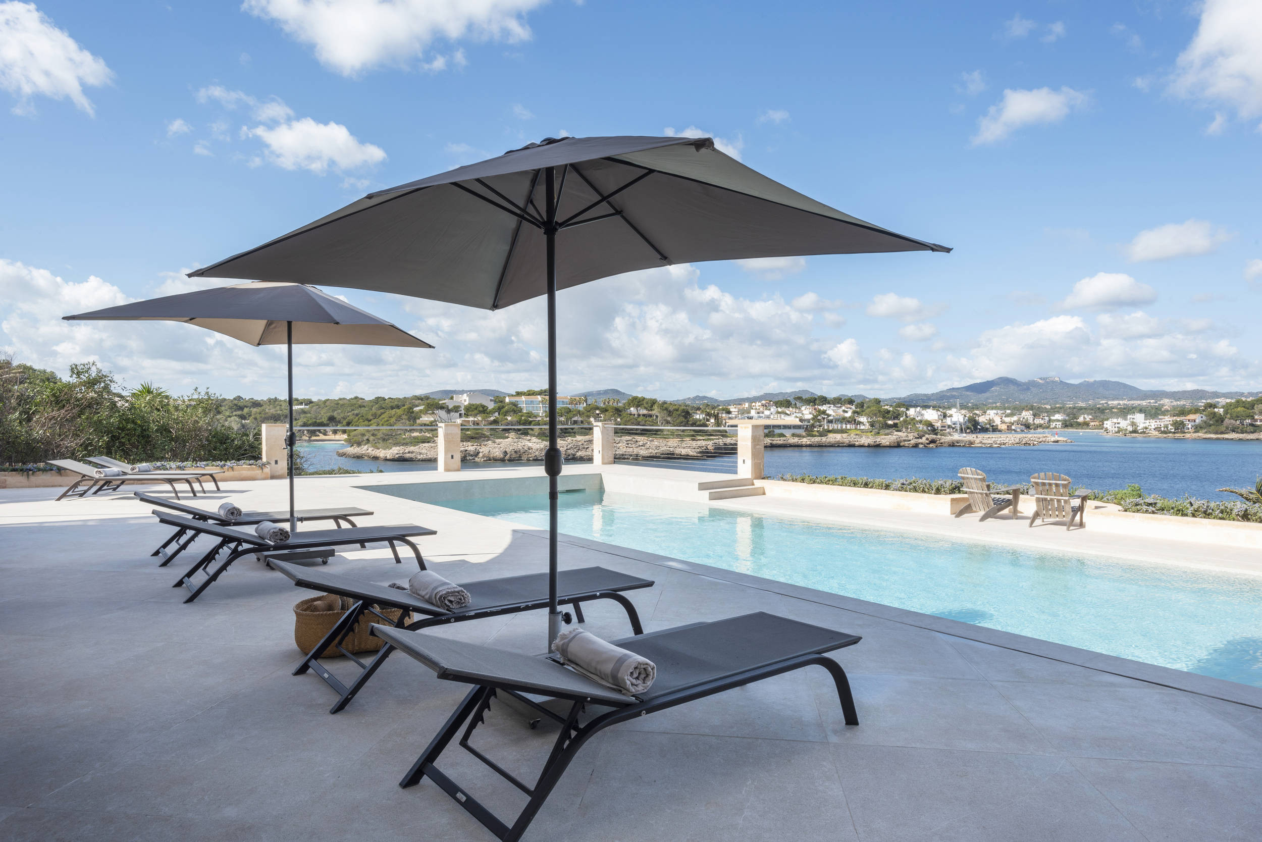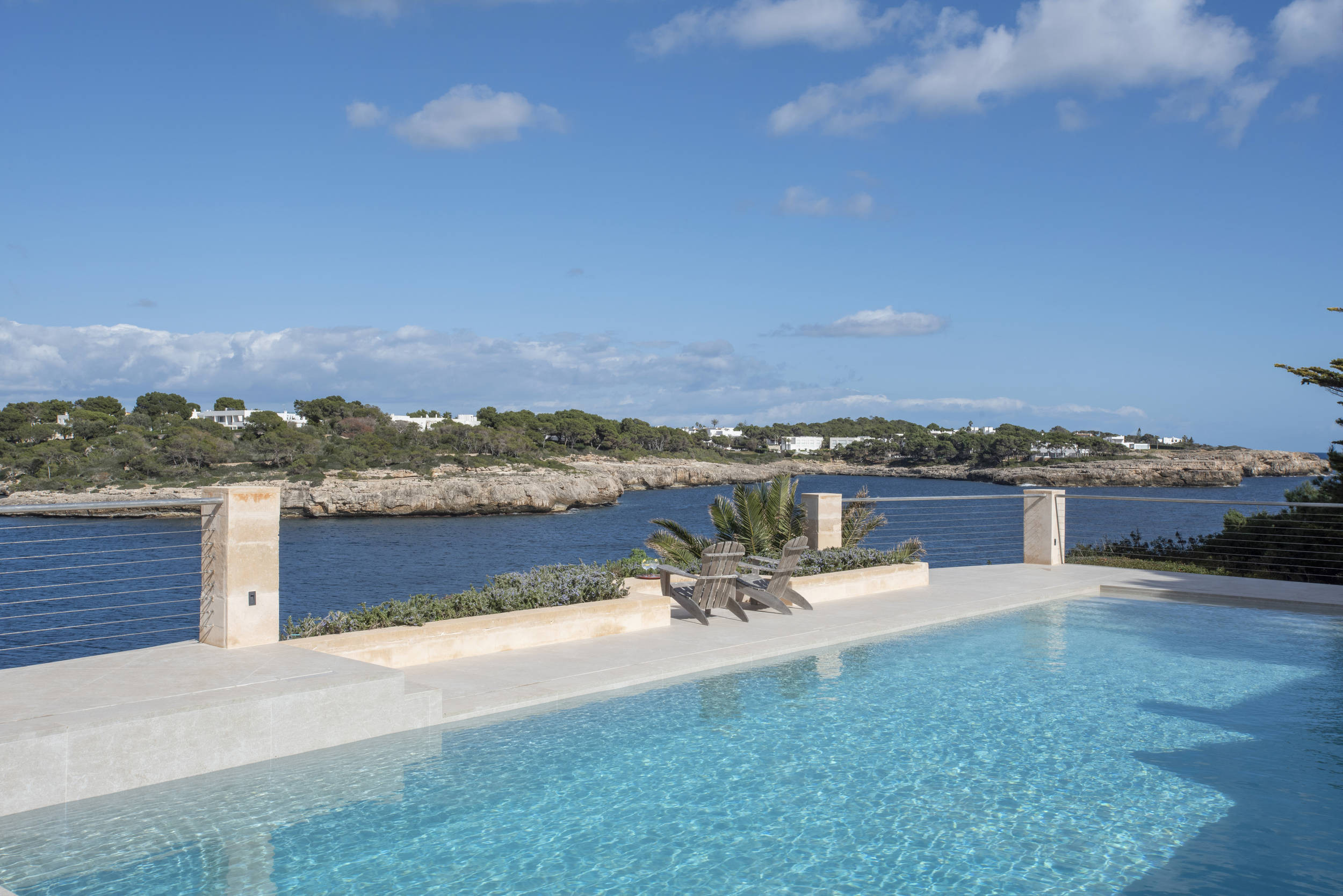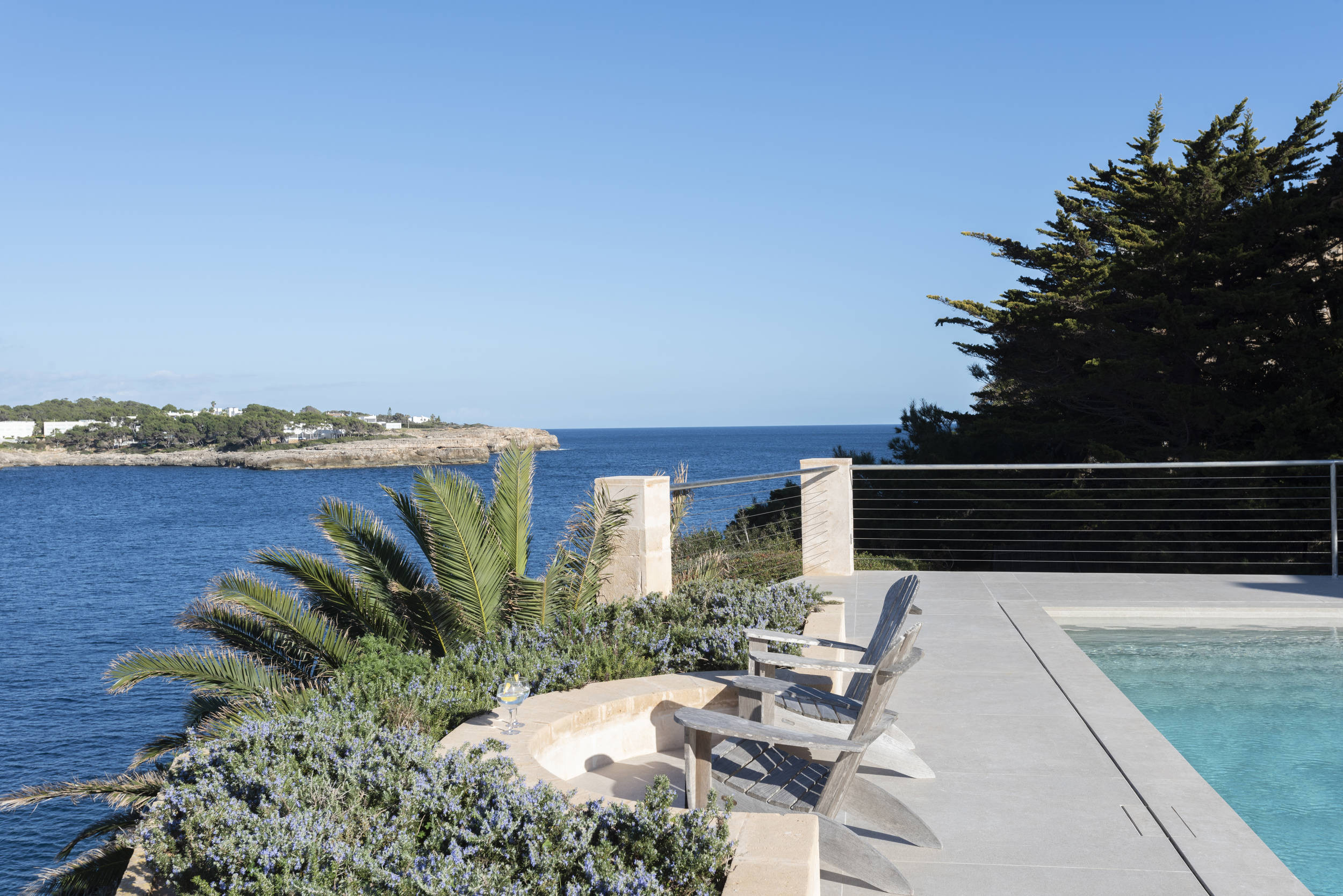 Villa Frontline Sa Torre ist eine moderne, neu gestaltete Ferienvilla mit einem schönen Poolbereich direkt am Meer in Porto Petro, Mallorca