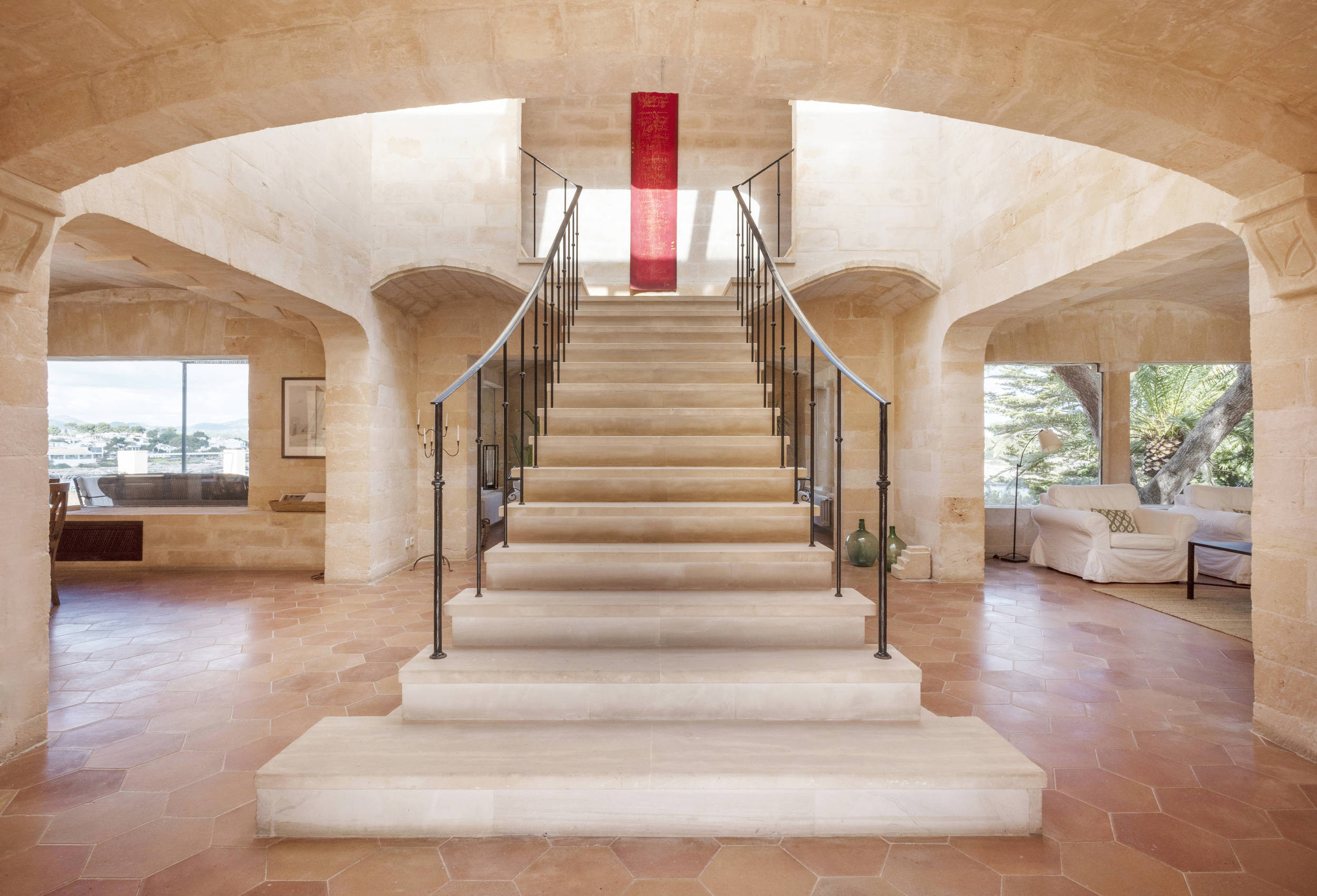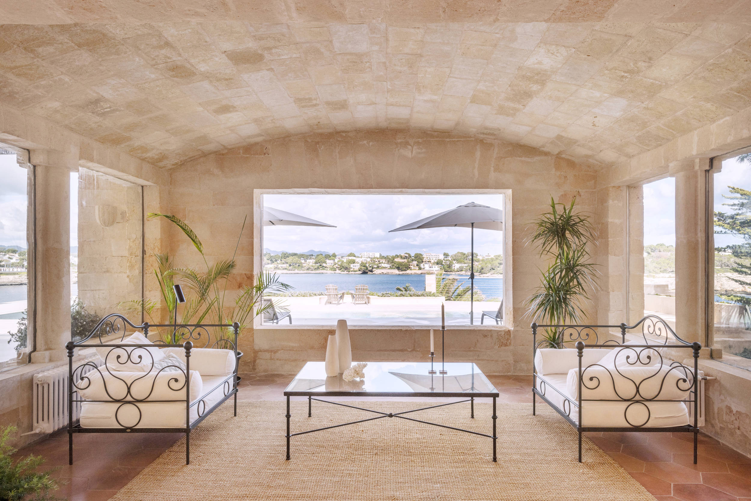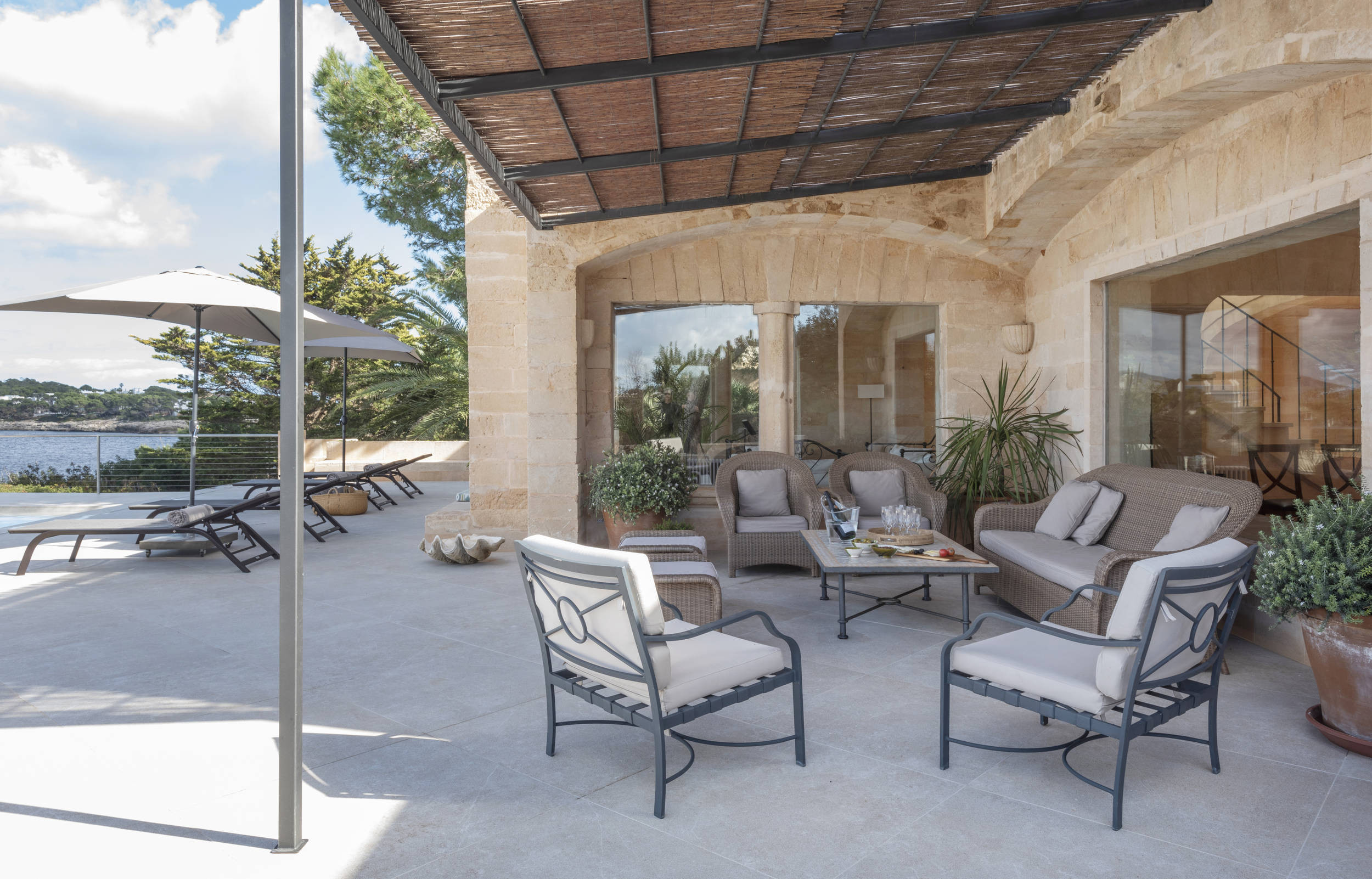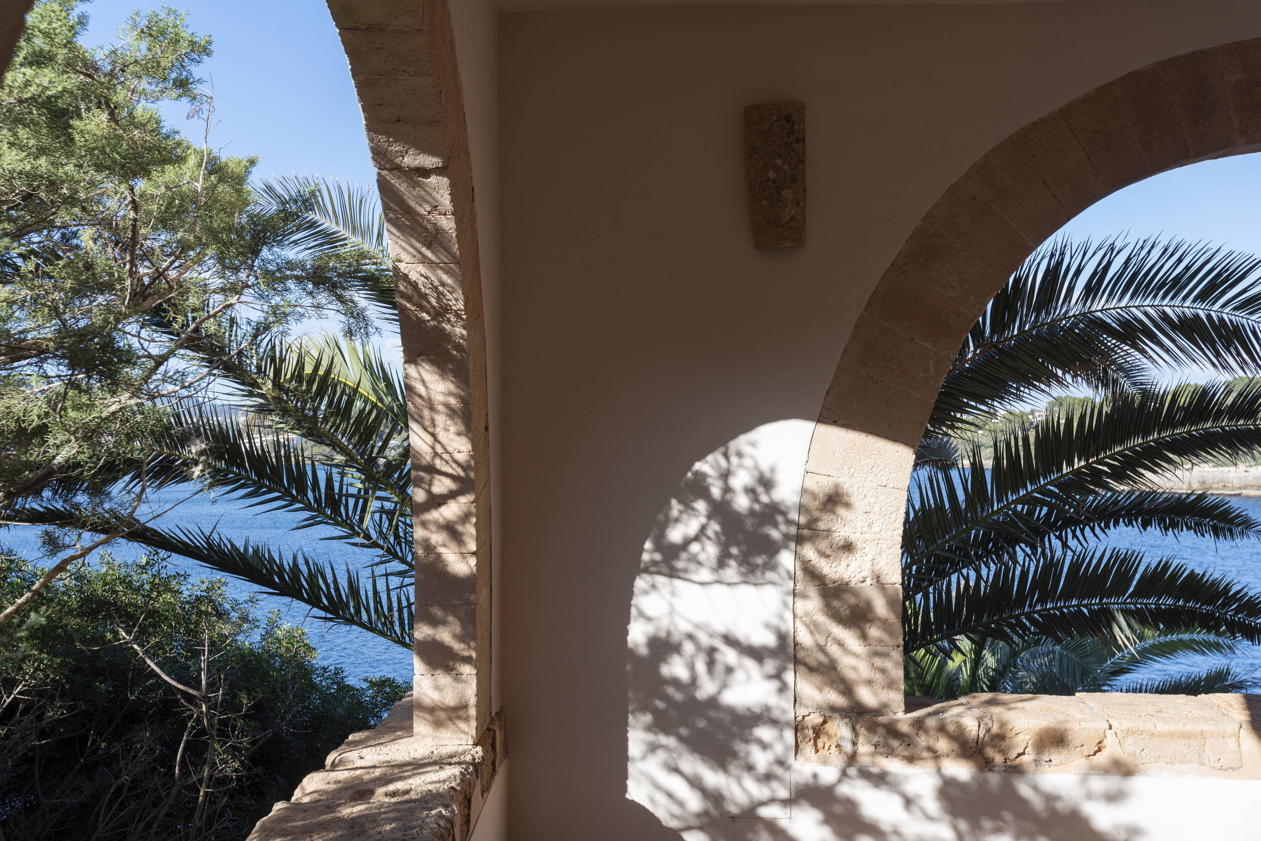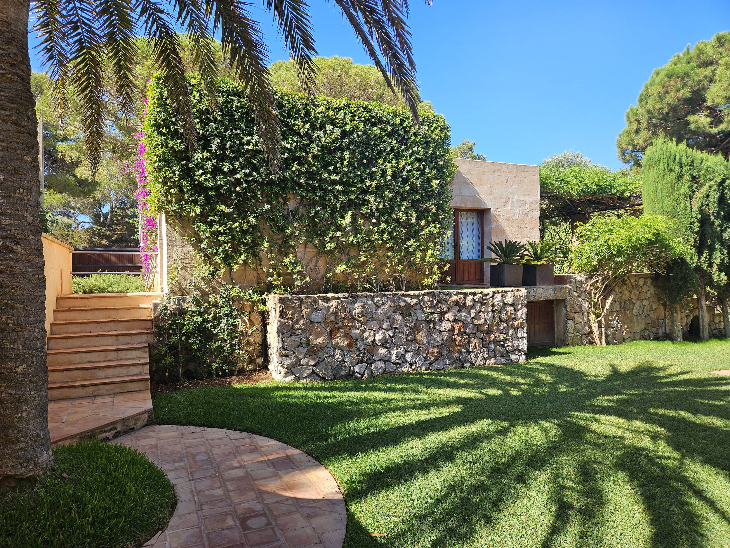 Diese herrliche Villa ist ideal für Strandliebhaber, da es in der Nähe mehrere Strände gibt, wie z.B. den schönen Sandstrand und das türkisfarbene Wasser von Cala Mondrago. Der nächstgelegene Strand, Calo des Homes Morts, kann vom Haus aus gesehen werden und Cala Sa Torre ist nur etwa 400 Meter entfernt. Die charmanten Geschäfte und Restaurants an der Promenade von Porto Petro sind ebenfalls zu Fuß erreichbar. Die Villa ist eine elegante Familienresidenz mit Natursteinwänden und einer beruhigenden, neutralen Inneneinrichtung, die ein Gefühl von luxuriösem Komfort vermittelt. Im Erdgeschoss befinden sich eine gut ausgestattete Küche und ein geräumiges, offenes Wohnzimmer mit zwei separaten Wohnbereichen und einem Esszimmer. Dieser Raum ist durch die großen Fenster lichtdurchflutet und bietet einen wunderschönen Meerblick. Flügeltüren führen auf eine überdachte Essterrasse und einen Sitzbereich im Freien.