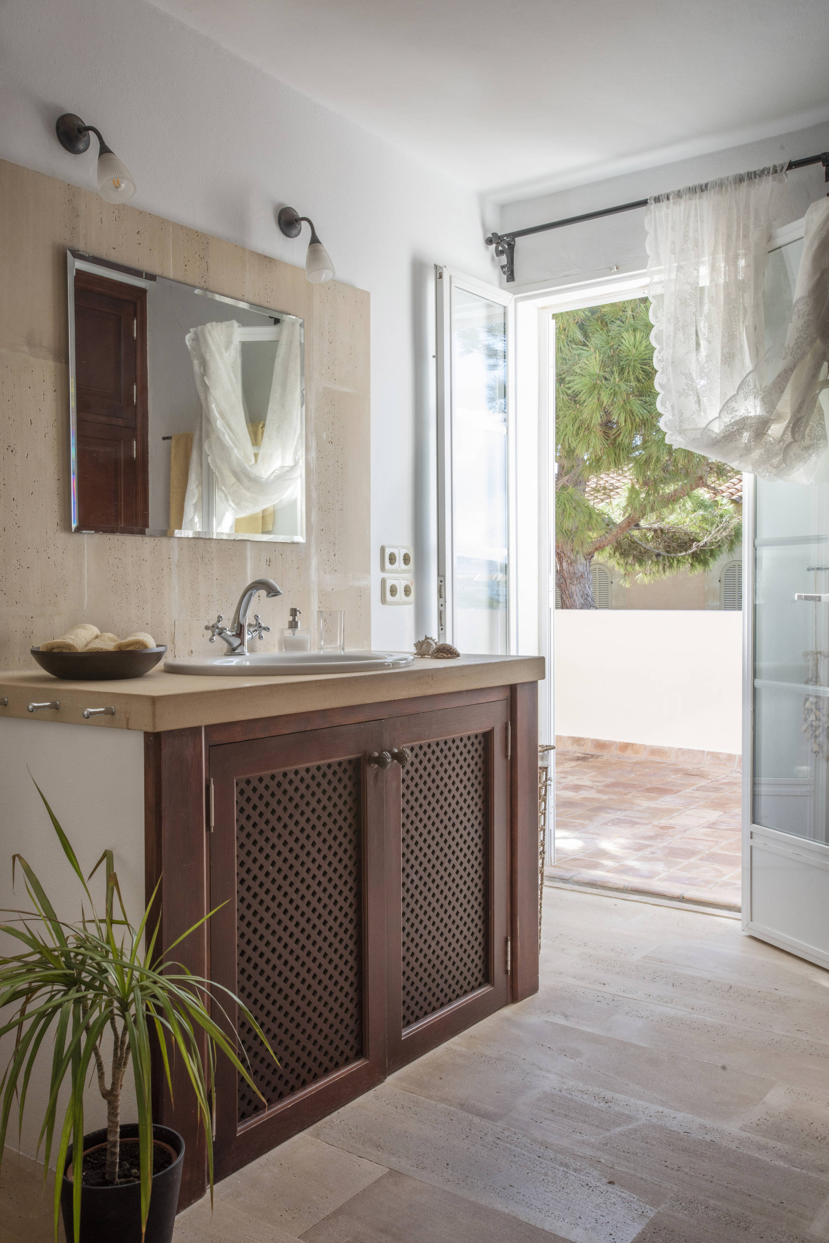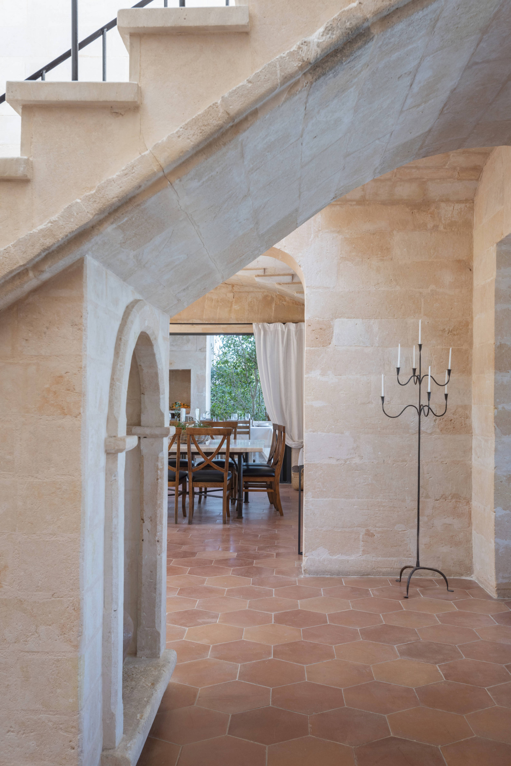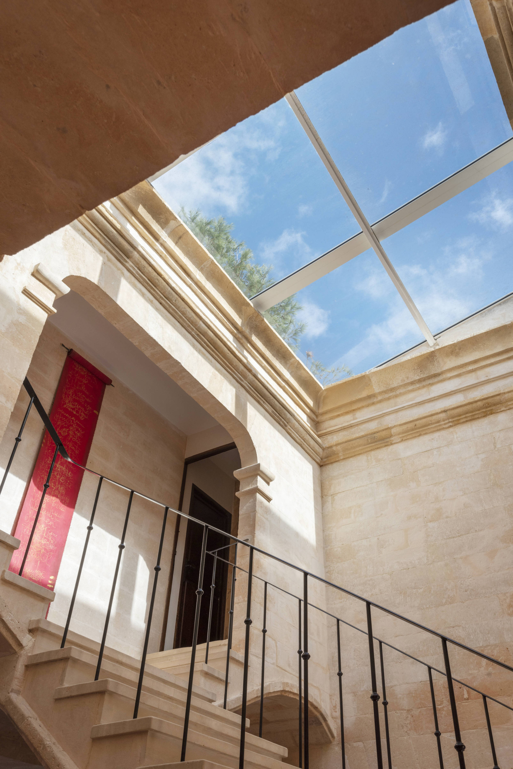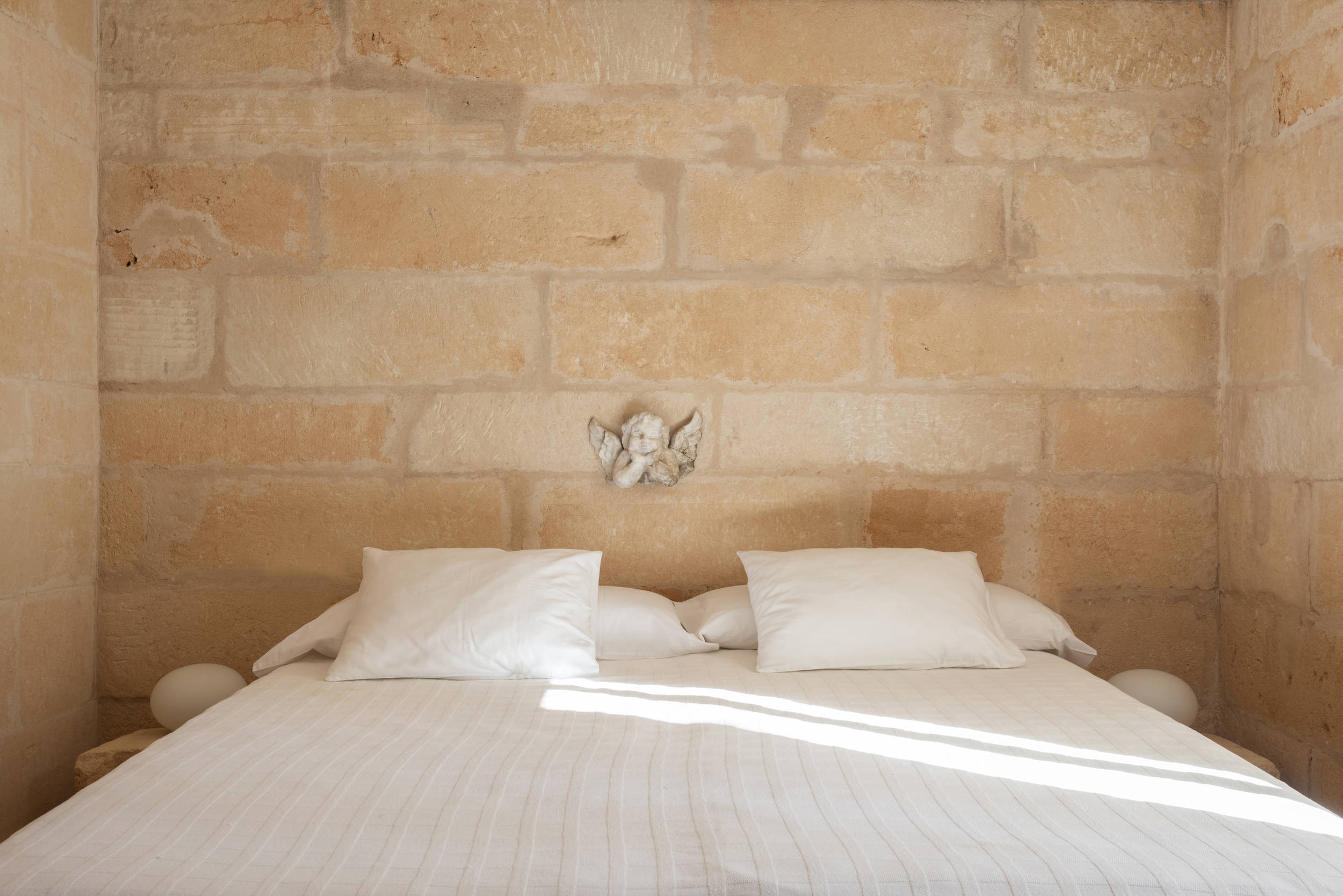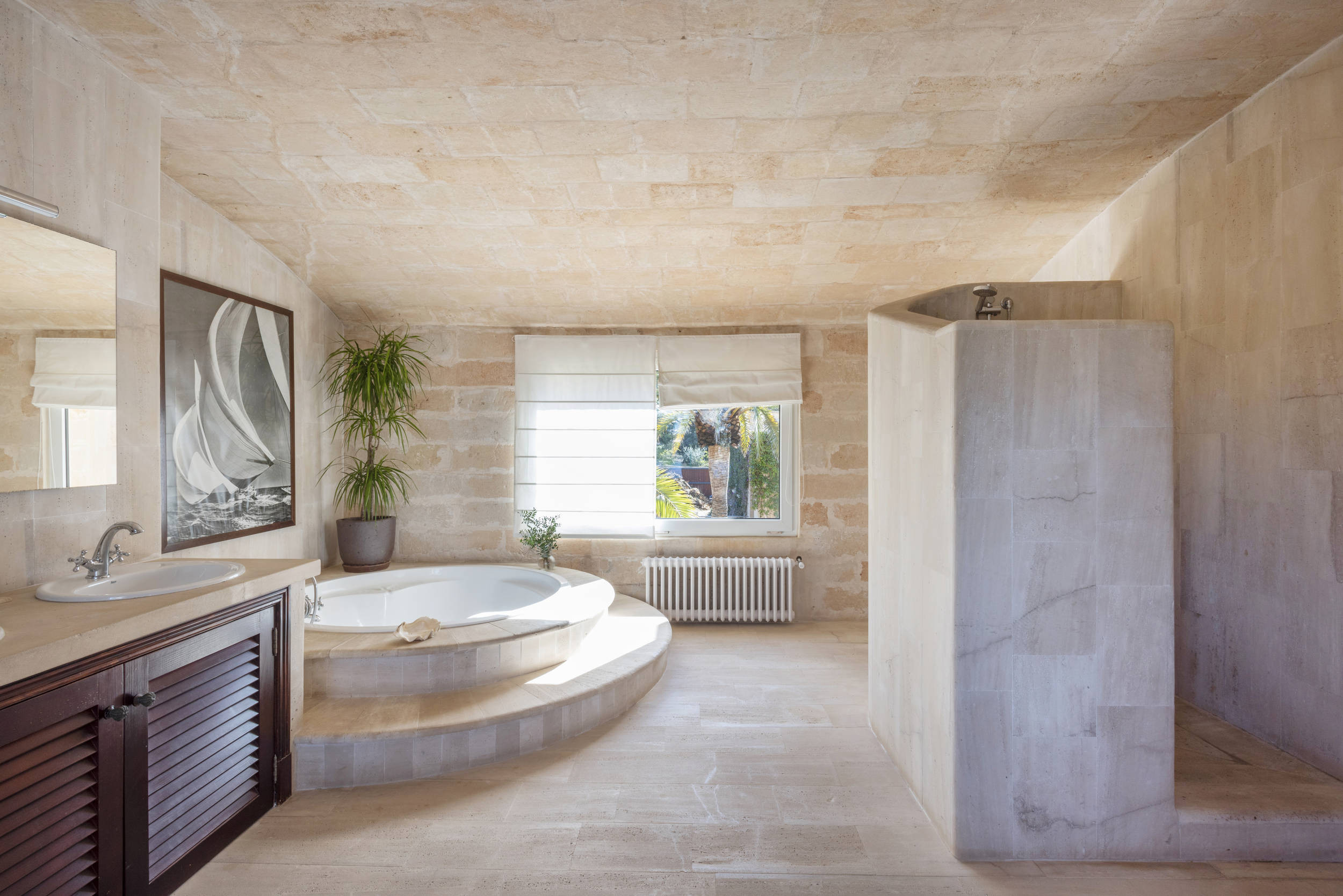 Eine beeindruckende Steintreppe führt in den ersten Stock, wo sich das Hauptschlafzimmer befindet. Das Hauptschlafzimmer hat Meerblick und ein geräumiges Bad mit Badewanne und separater Dusche. Außerdem gibt es auf dieser Etage zwei weitere Schlafzimmer: ein Doppelzimmer mit Zugang zu einer möblierten Terrasse, mit herrlichem Blick auf die Bucht von Portopetro, die zum Entspannen oder Sonnenbaden einlädt, und ein weiteres mit zwei Einzelbetten und eigenem Bad mit Dusche.