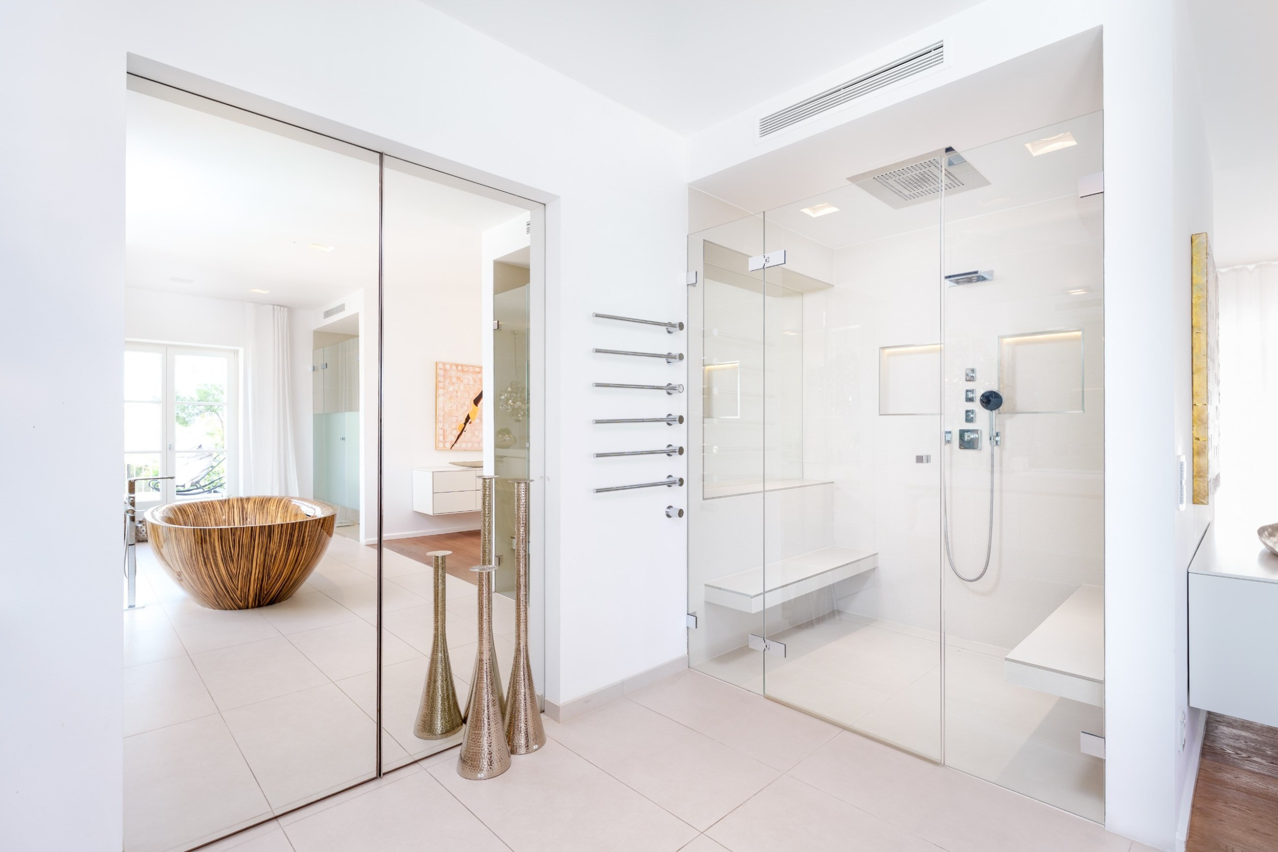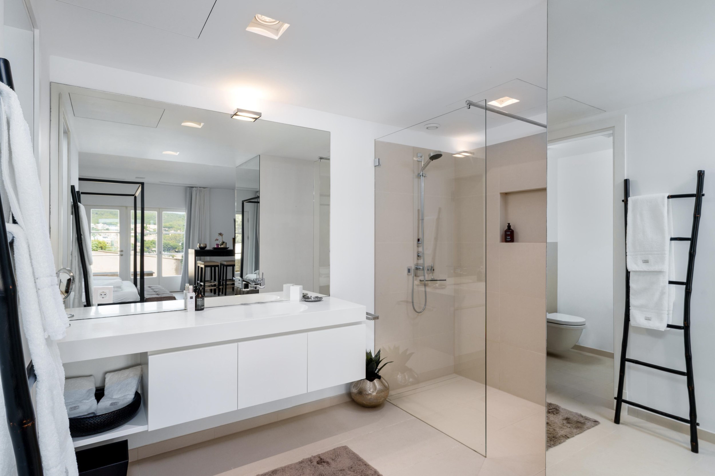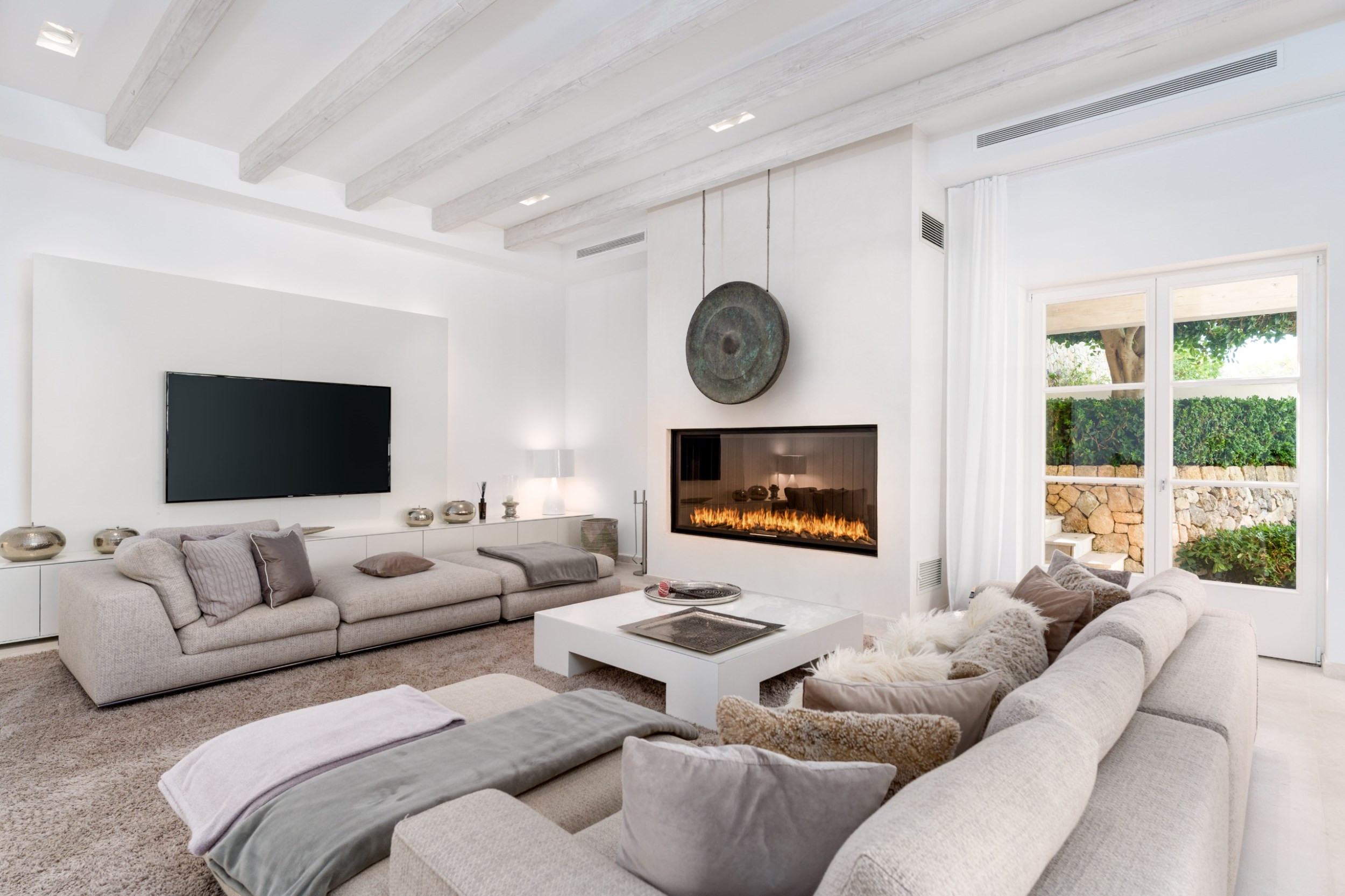 The villa is designed across three levels, showcasing a contemporary aesthetic with multiple lounge areas available both inside and outside. Each bedroom is equipped with satellite television and features its own private en-suite bathroom. Guests can unwind on various terraces, whether they seek shade or sunlight, take a dip in the heated infinity pool or hot tub, or maintain their fitness routine with state-of-the-art Technogym equipment. The property is equipped with a centrally controlled air conditioning system and underfloor heating, ensuring a comfortable environment year-round. Additionally, a double garage is attached to the villa, complemented by extra outdoor parking.