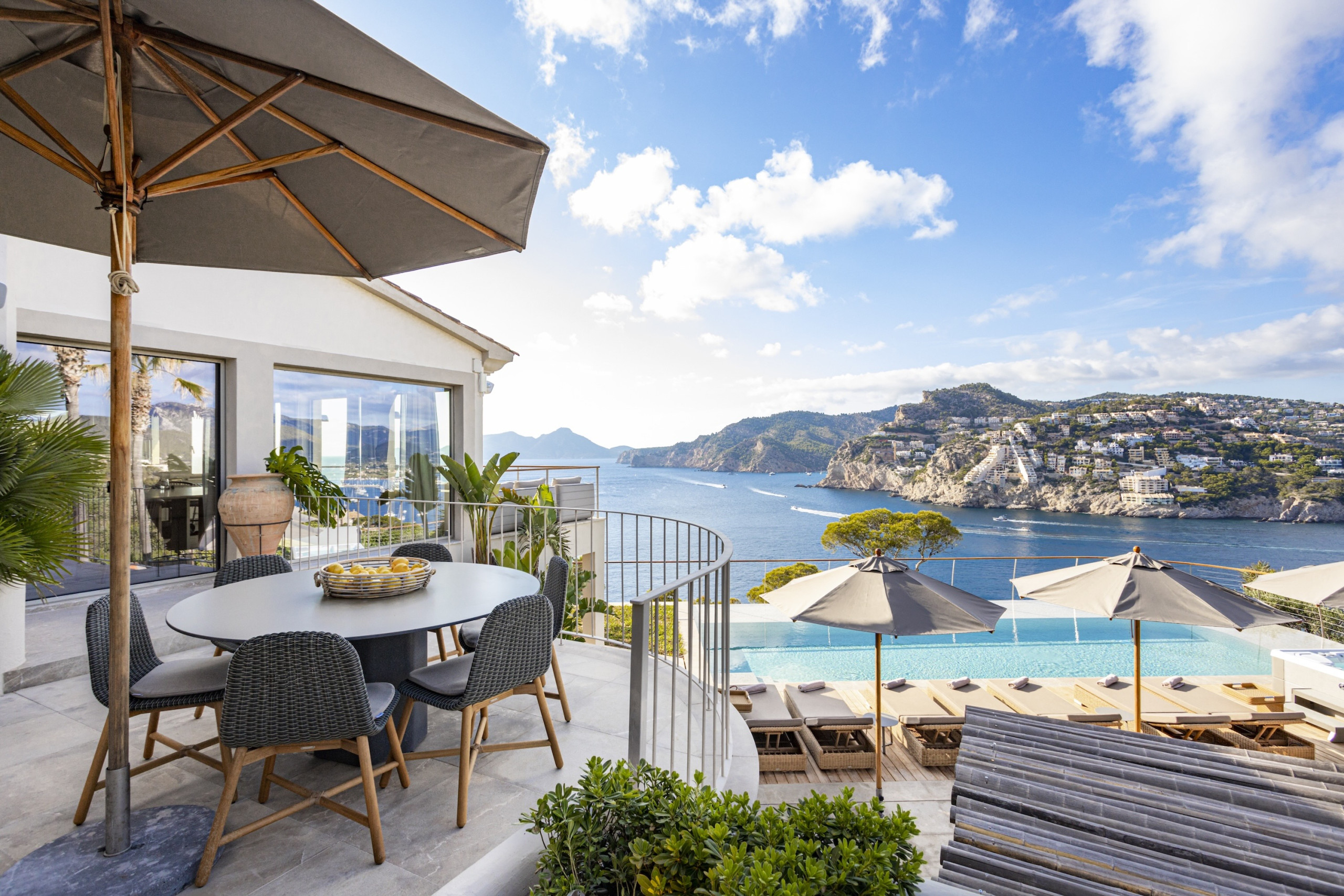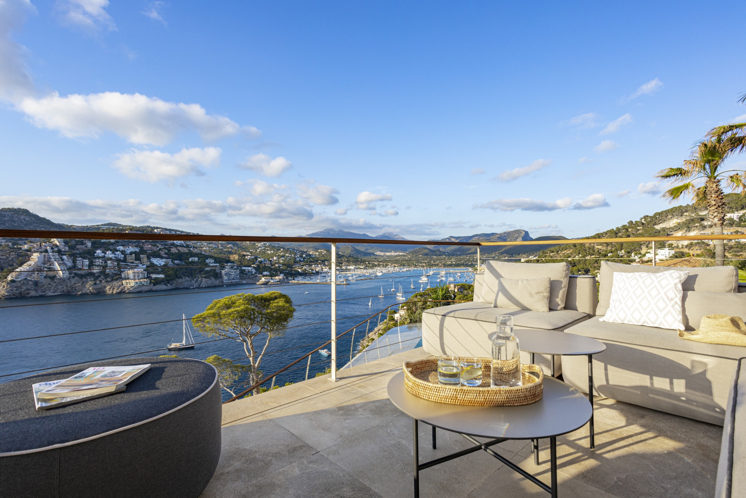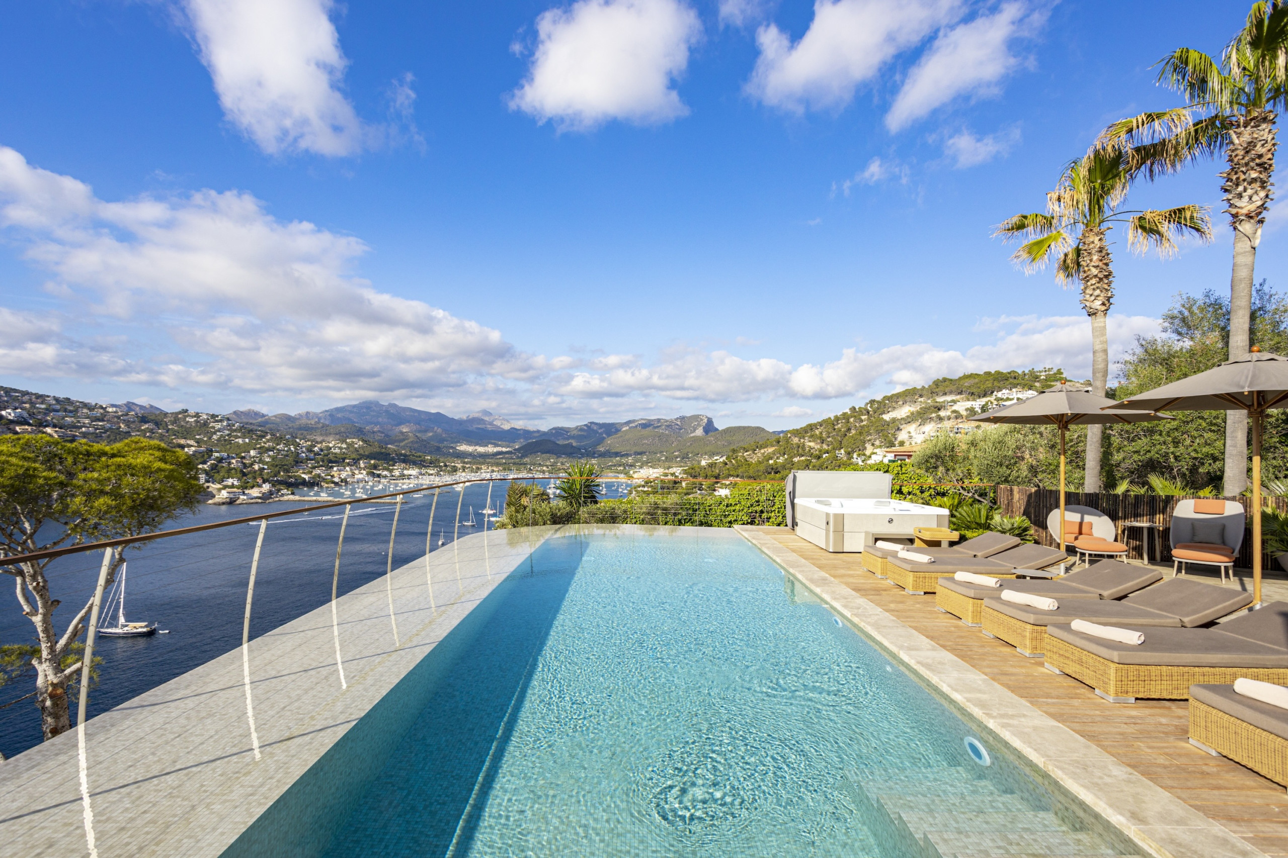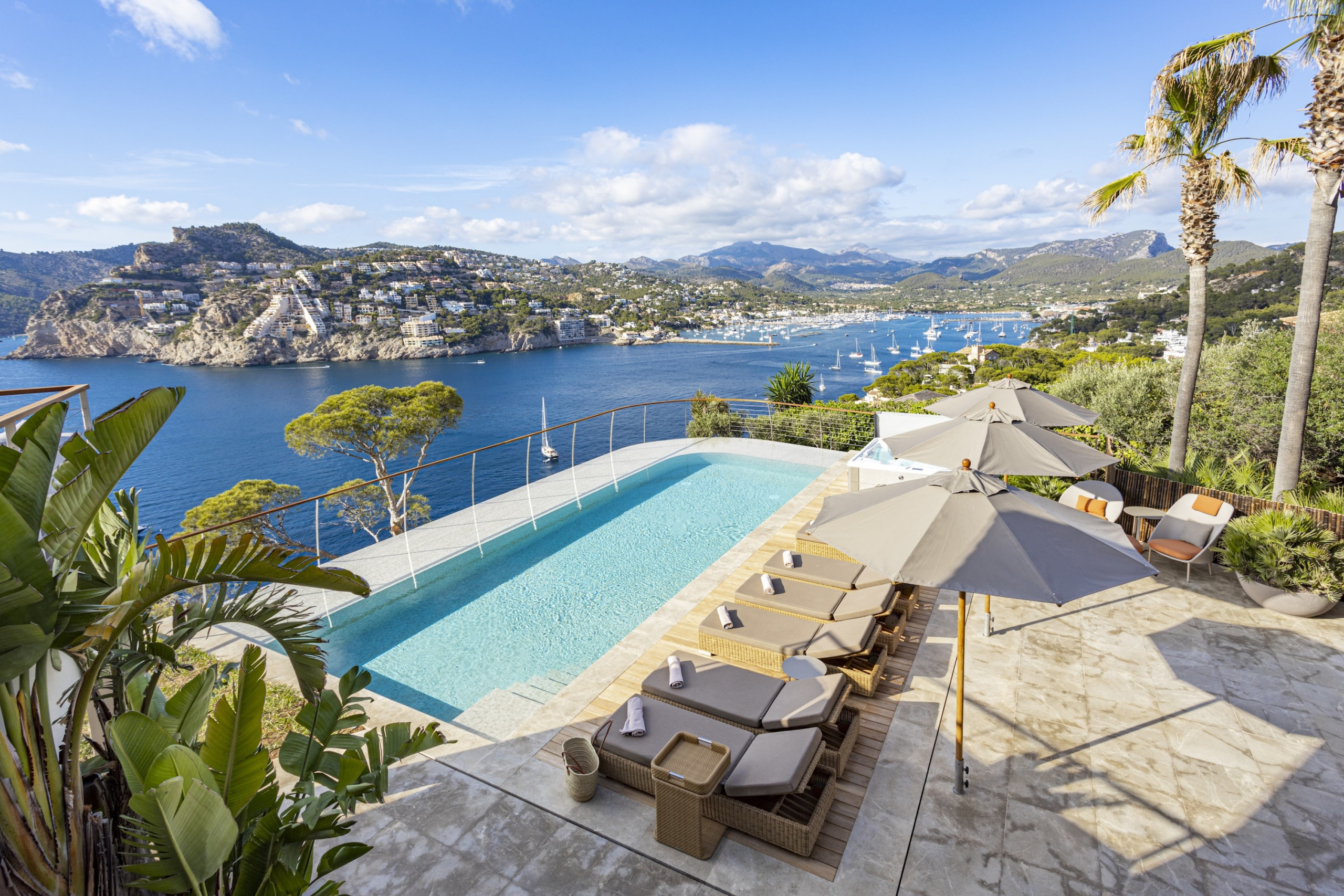 6 bedroom, 6 bathroom luxury villa in Port d’Andratx Mallorca with panoramic sea and harbour views, heated private swimming pool, jacuzzi, sauna, gym, outdoor kitchen, daily cleaning service and sleeps up to 12 guestsPerched just above the exclusive harbour of Port d’Andratx, Villa Mimosa is an exceptional luxury villa in Port d’Andratx Mallorca offering breathtaking panoramic views across the harbour, the sparkling Mediterranean Sea and the dramatic Tramuntana Mountains. Combining privacy, elegance and modern comfort, the villa provides the perfect setting for a truly unforgettable holiday in Mallorca.