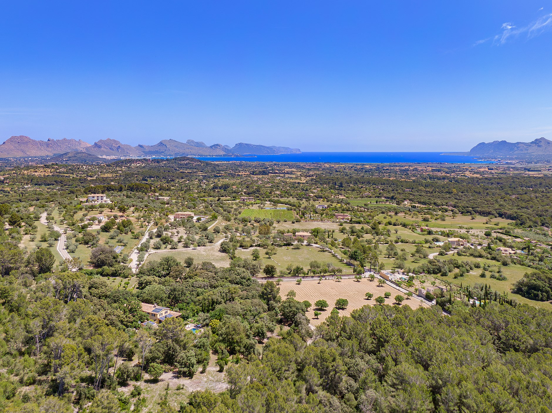 From the moment you first turn off the old country road Pollensa–Alcudia into the private single track lane and drive up the hill through the ancient cultivated olive- and almond groves, you sense the feeling, you are at the beginning of a memorable holiday – in Finca Gabino. This magnificent hilltop property commands the most wonderful far reaching views down the valley and to the sea.