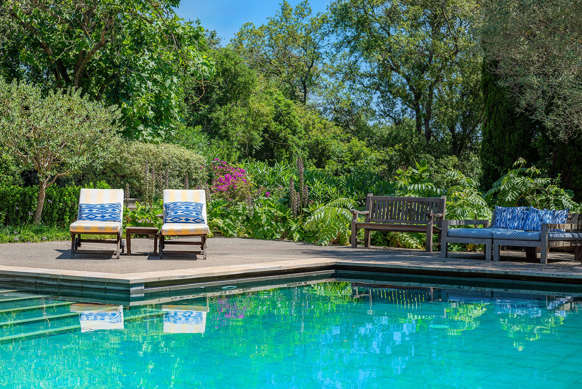 Twelve sunbeds around pool