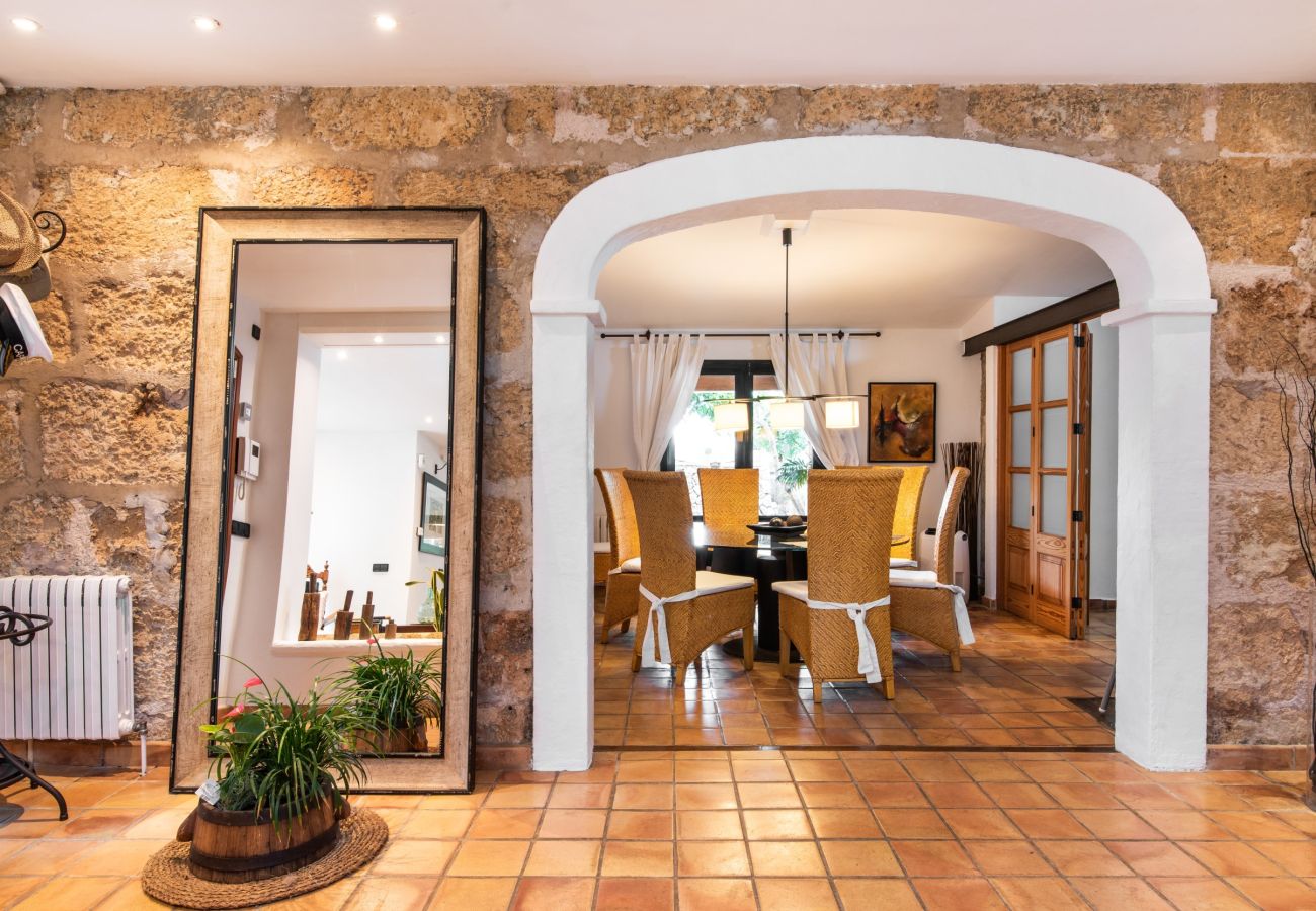 The entrance of the villa leads to the kitchen and to a very large sitting-dining room, which walls are made of rustic stones that create a charming, tipical mallorcan ambience.